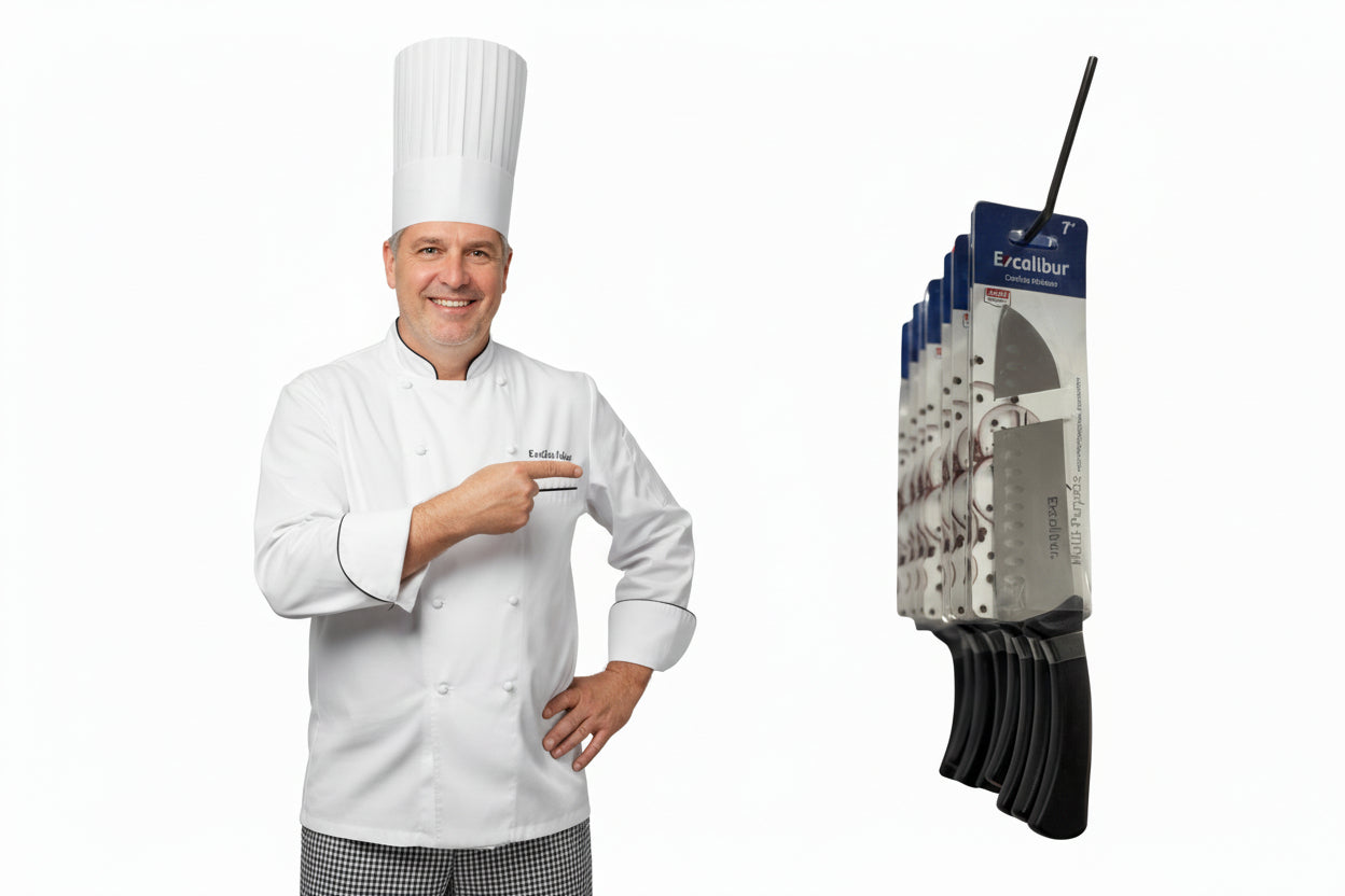 El cuchillo Santoku Excalibur de 7 pulgadas está diseñado para quienes buscan cortes limpios, control total y versatilidad real, tanto en parrilla como en cocina.