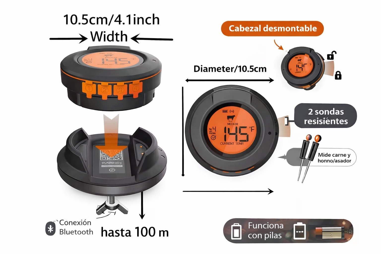 Es una herramienta pensada para quienes quieren precisión profesional, comodidad y resultados consistentes en asador tipo barril, parrilla u horno.